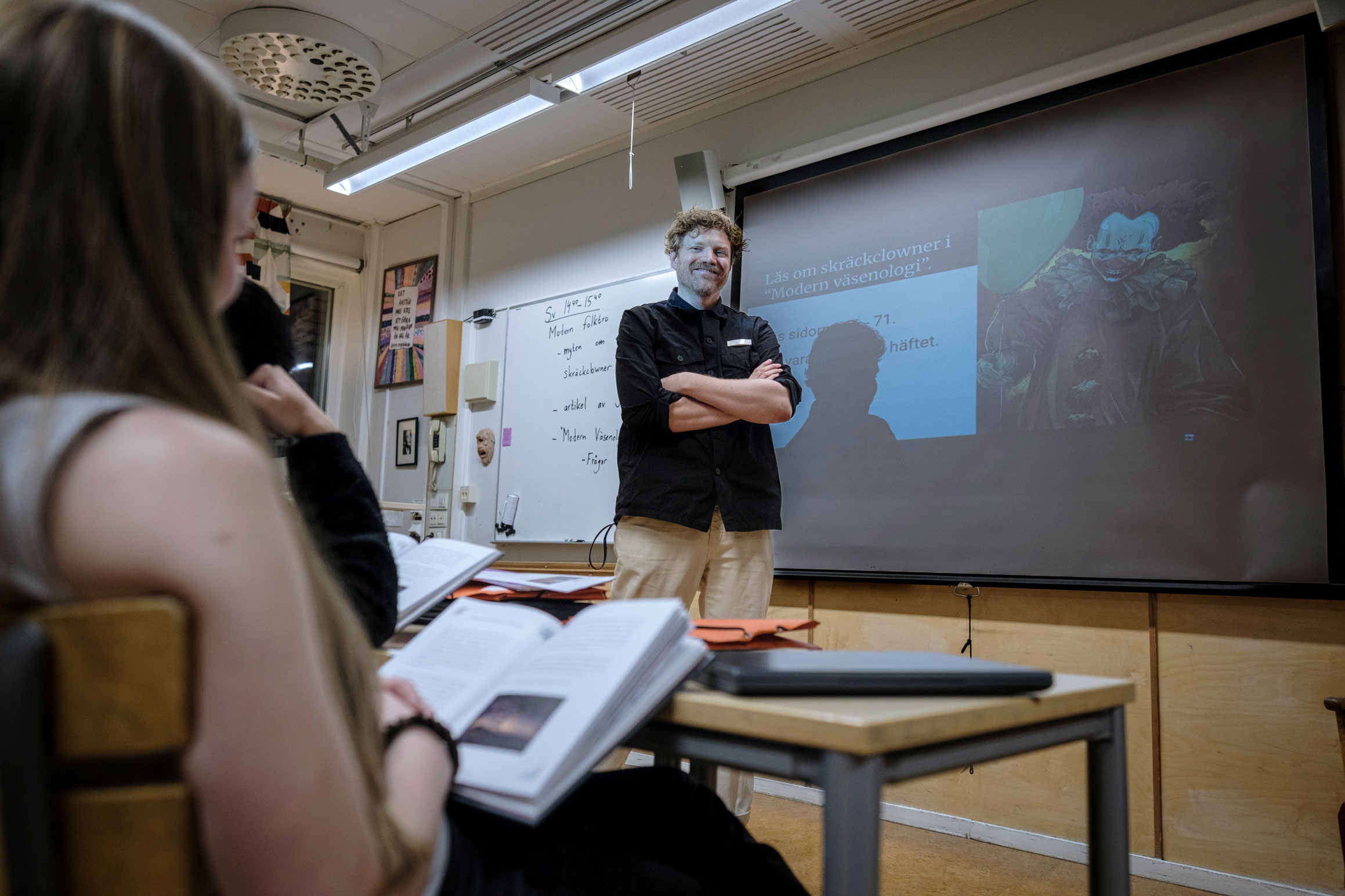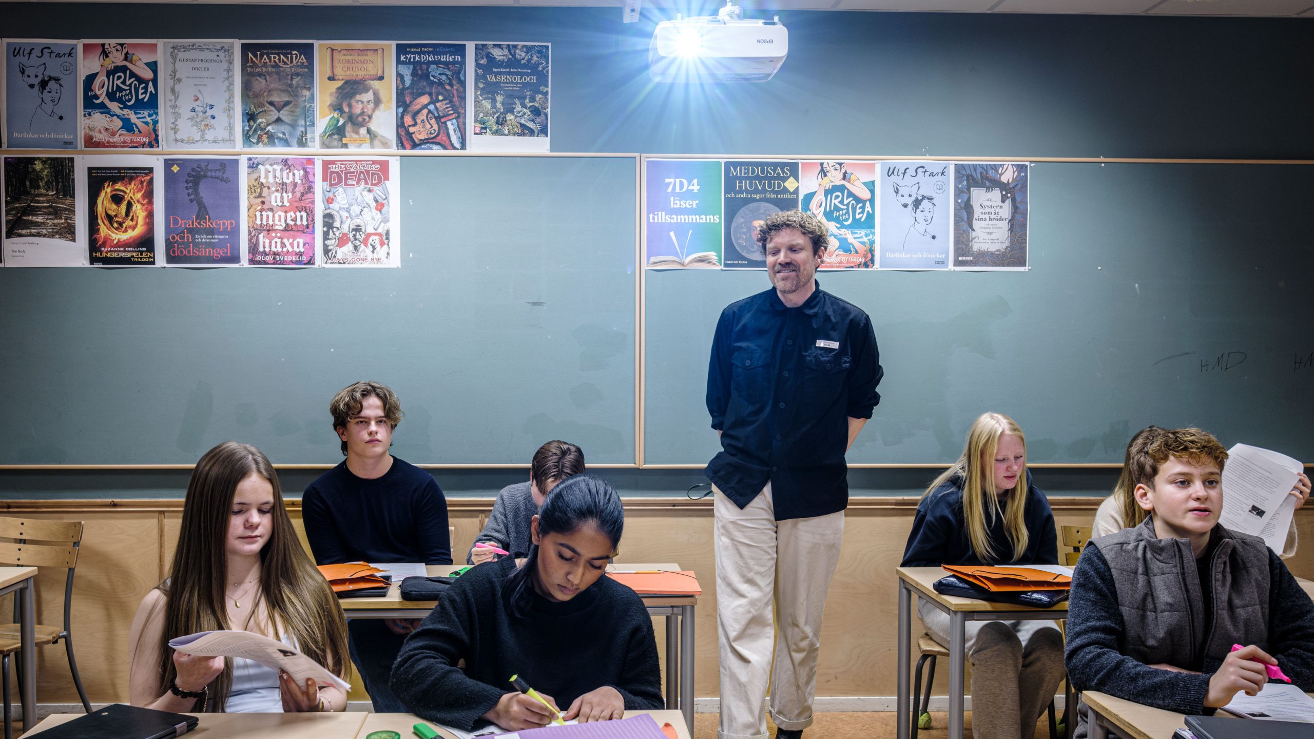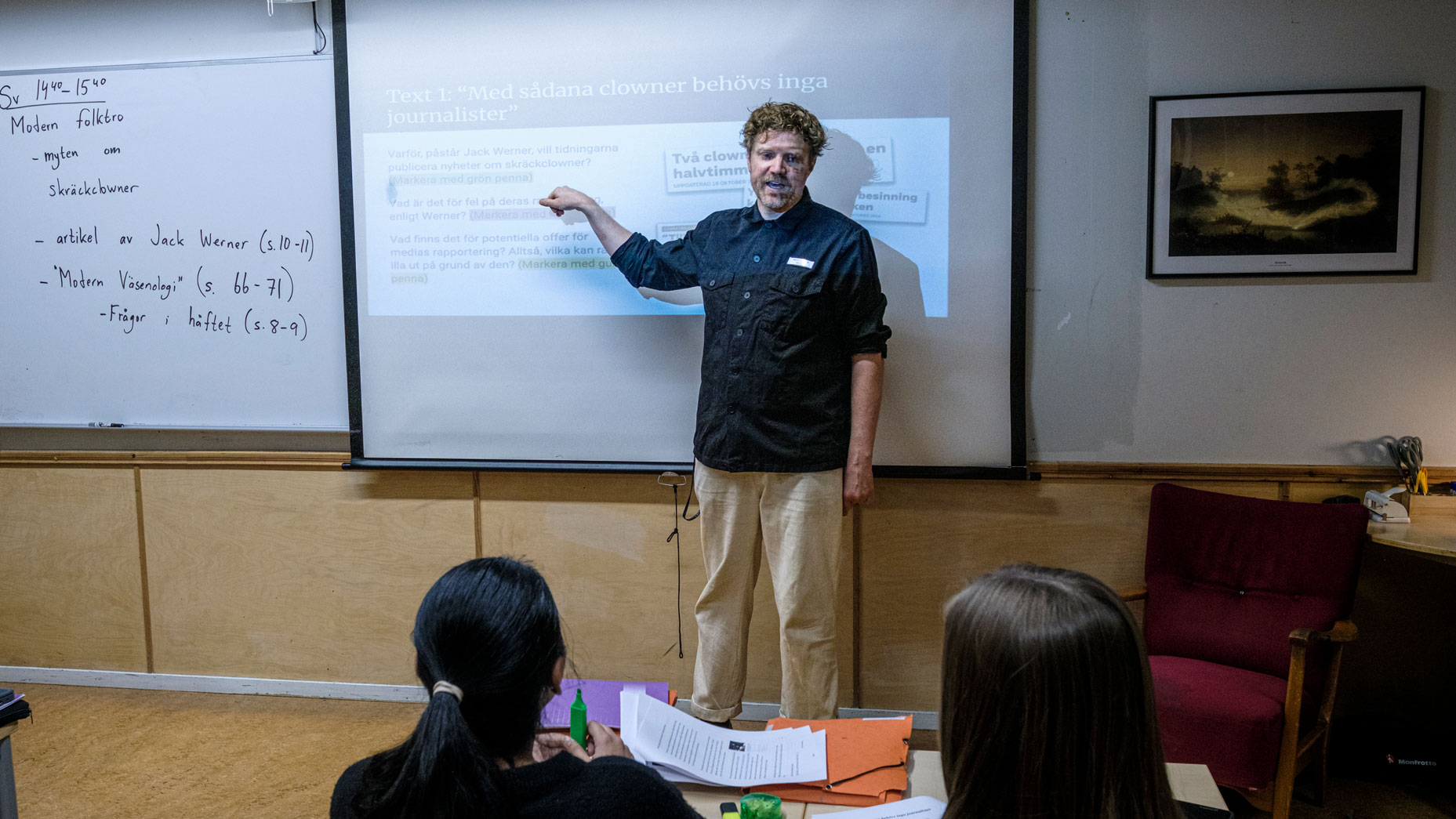 På väggarna i klassrummet hänger porträtt av Astrid Lindgren, Selma Lagerlöf och August Strindberg. Martin Flodkvist är svensklärare och har inget emot att undervisa i källkritik, men tycker att det är knepigt med betygssättningen.