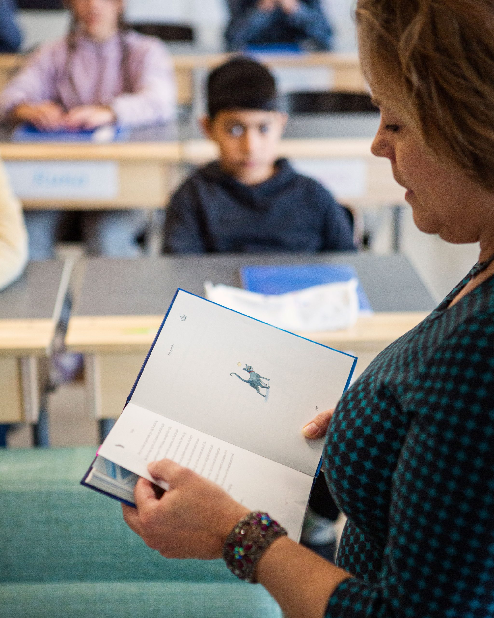 Hela terminen har klassen arbetat med ”Kaspar – en kunglig katt” av Michael Morpurgo, som är en av Stina Solums favoritböcker. I dag ska de läsa det sista kapitlet, och både elever och lärare känner av stämningen. Att jobba strukturerat med skönlitteratur i undervisningen är ett moment som Stina Solum kallar ”Stina läser”. På tavlan har hon skrivit ner dagens lässtrategi: först ska eleverna lyssna, sedan samtala, därefter skriva och sist – gestalta. Allt med utgångspunkt från boken.